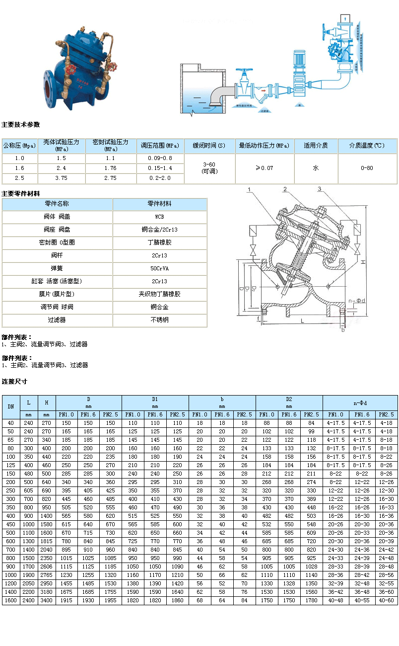 工作特點 1、防止水錘效果好,將緩開、止回速閉、緩閉等消除水錘的技術一體化,防止開泵不錘和停泵倒流與水錘對供水管路和水泵的損害。 2、操作方便,無需為閥門另配電控系統,閥門隨水泵的開啟與停止自動并按順序完成控制功能。通過設定調節閥開度可得到合適的控制參數。3、閥體采用了全通道、直流式、流線型設計。水力損失小,節能效果好。