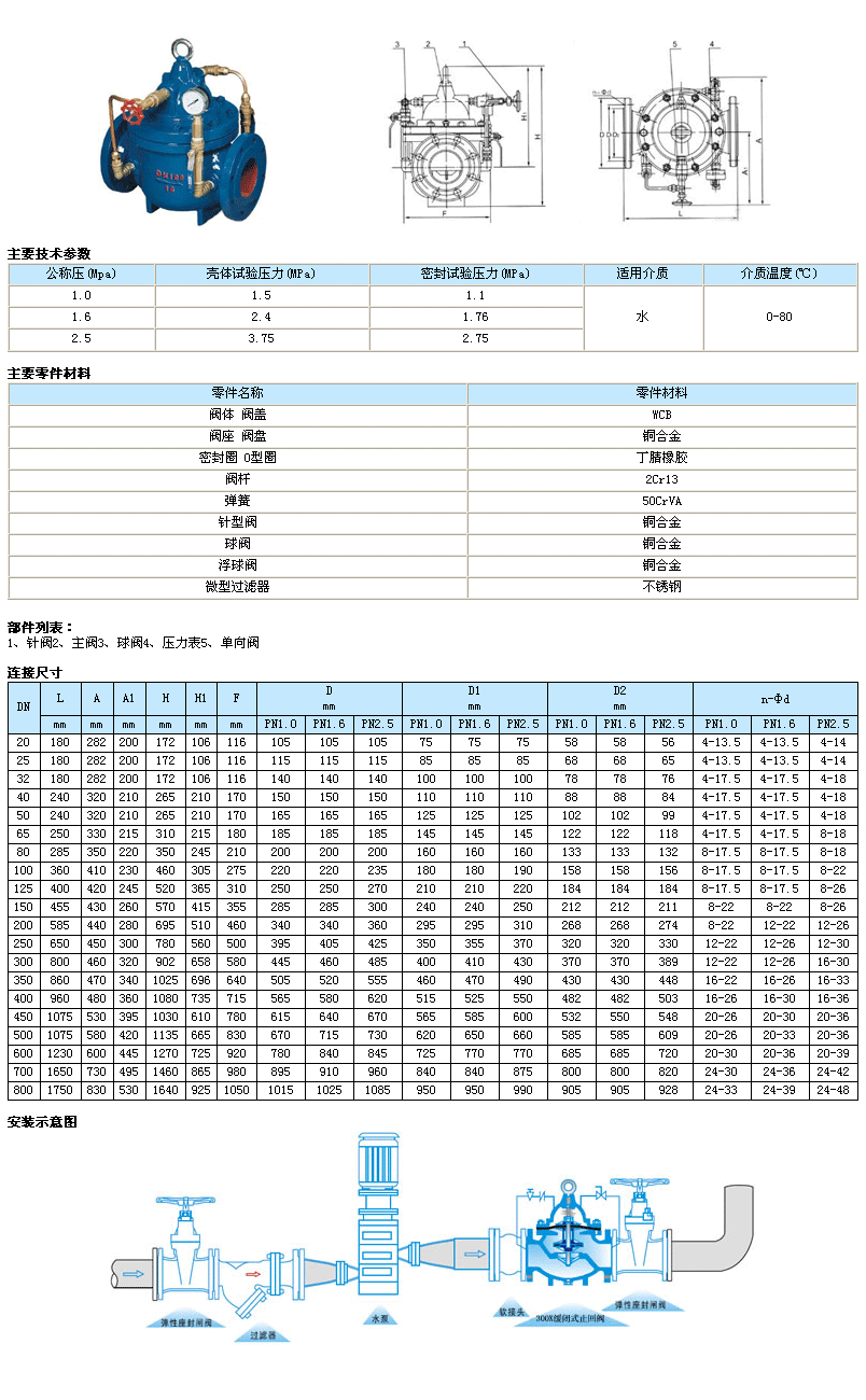 300X緩閉止回閥由主閥、單向閥、針閥、球閥、微形過濾器和壓力表組成水力控制接管系統。利用水力自動操作,可使主閥得到佳的開啟或關閉速度。防止水鍾水擊的產生,以達到緩閉消聲的效果。本產品利用水力自力控制,不需要其它裝置和能源,保養簡便,開啟及緩閉平穩。本系列閥門產品廣泛用于高層建筑、生活區等供水管網系統及城市供水工程。當閥門從進口端給水時,水通過微型過濾器、針閥、單向閥進入主閥控制室,再經過球閥排水至下游。因為針閥開度小于球閥開度,即主閥控制室的排水速度大于進水速度,因此控制室壓力降低,作用于主閥盤下端的進口壓力打開主閥向下游供水。當管道停止供水時,若下游水開始回流,一部分回流水經球閥進入主控制室,由于單向閥作用,回流水不能從主控制室流出,引起主控制室逐漸升壓,緩緩關閉主閥。 |